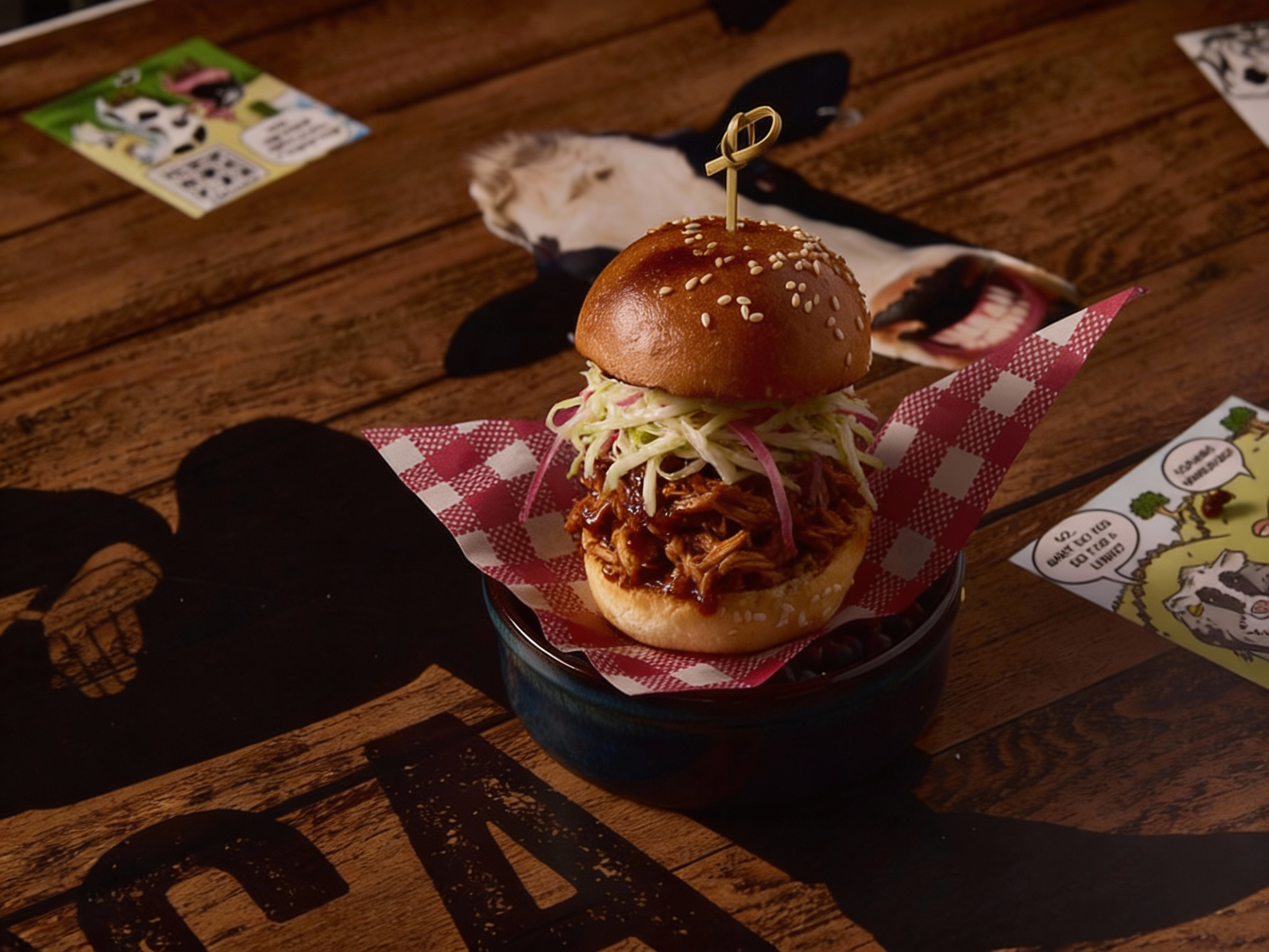 Pickle Onion, Carrot, Coriander, Slaw, and Chipotle Aioli on Tiger Bun